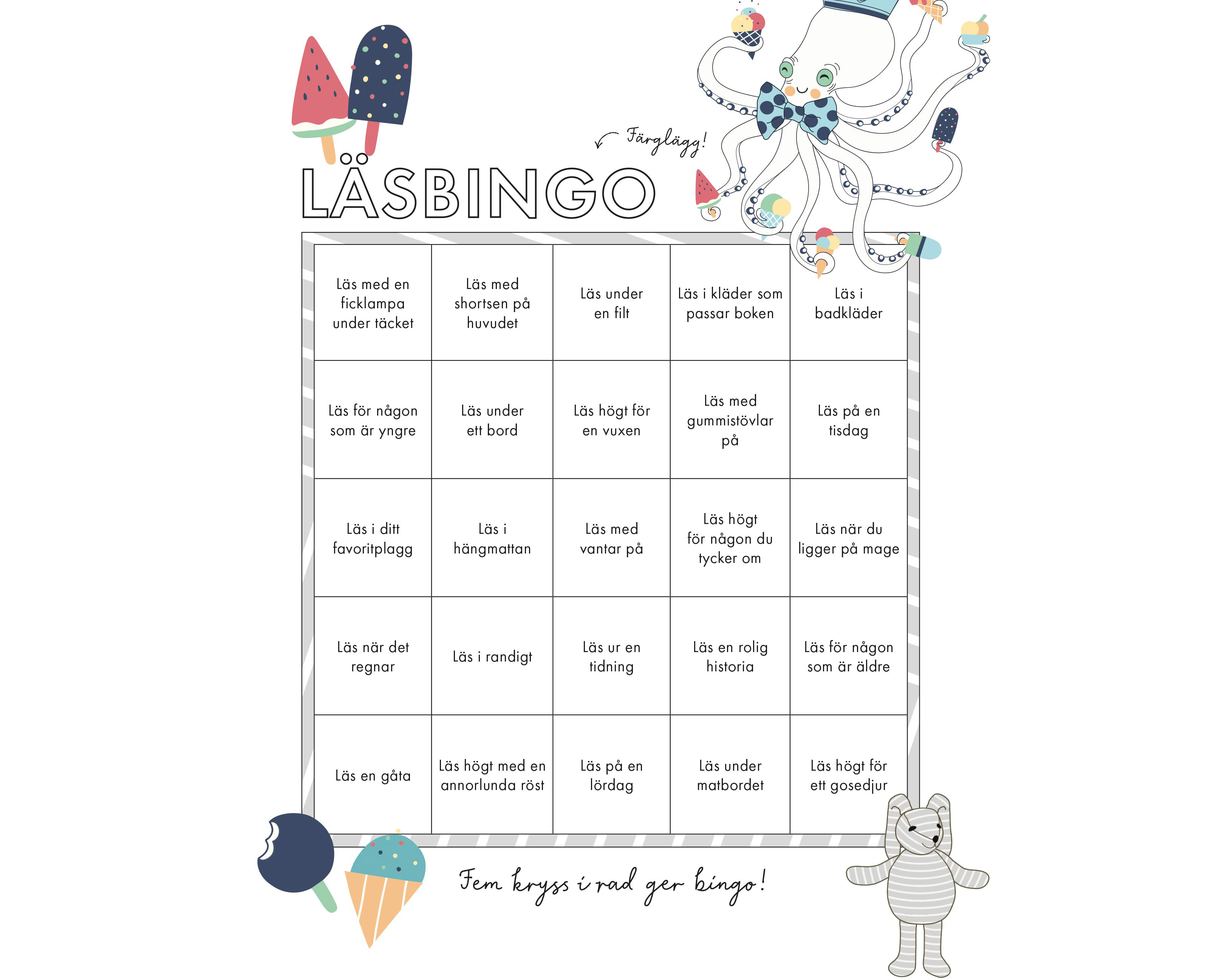 Inspirera och utmana barnen till att bli riktiga superläsare i sommar med Polarn O. Pyrets nya läsbingo! Skriv ut bingoplattan och läs sammanhängande i minst tio minuter för att få kryssa för en ruta – fem kryss i rad ger bingo. Kanske får den som ropar bingo ett diplom, pris eller en glass? Fantasin sätter gränserna!