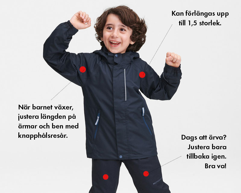 - Plagget har flera justeringslägen vilket gör att plagget kan växa i takt med barnet. På så sätt undviker man att barnet använder ett plagg som är för stort eller att plagget slits i onödan.